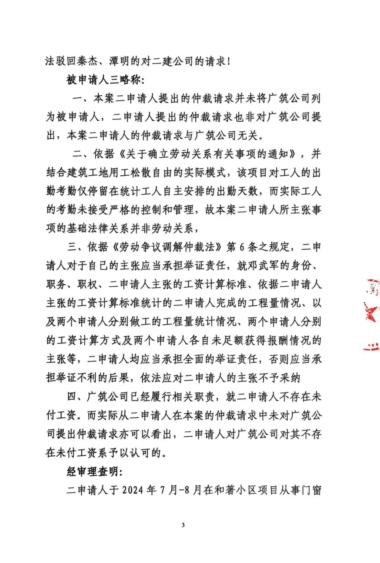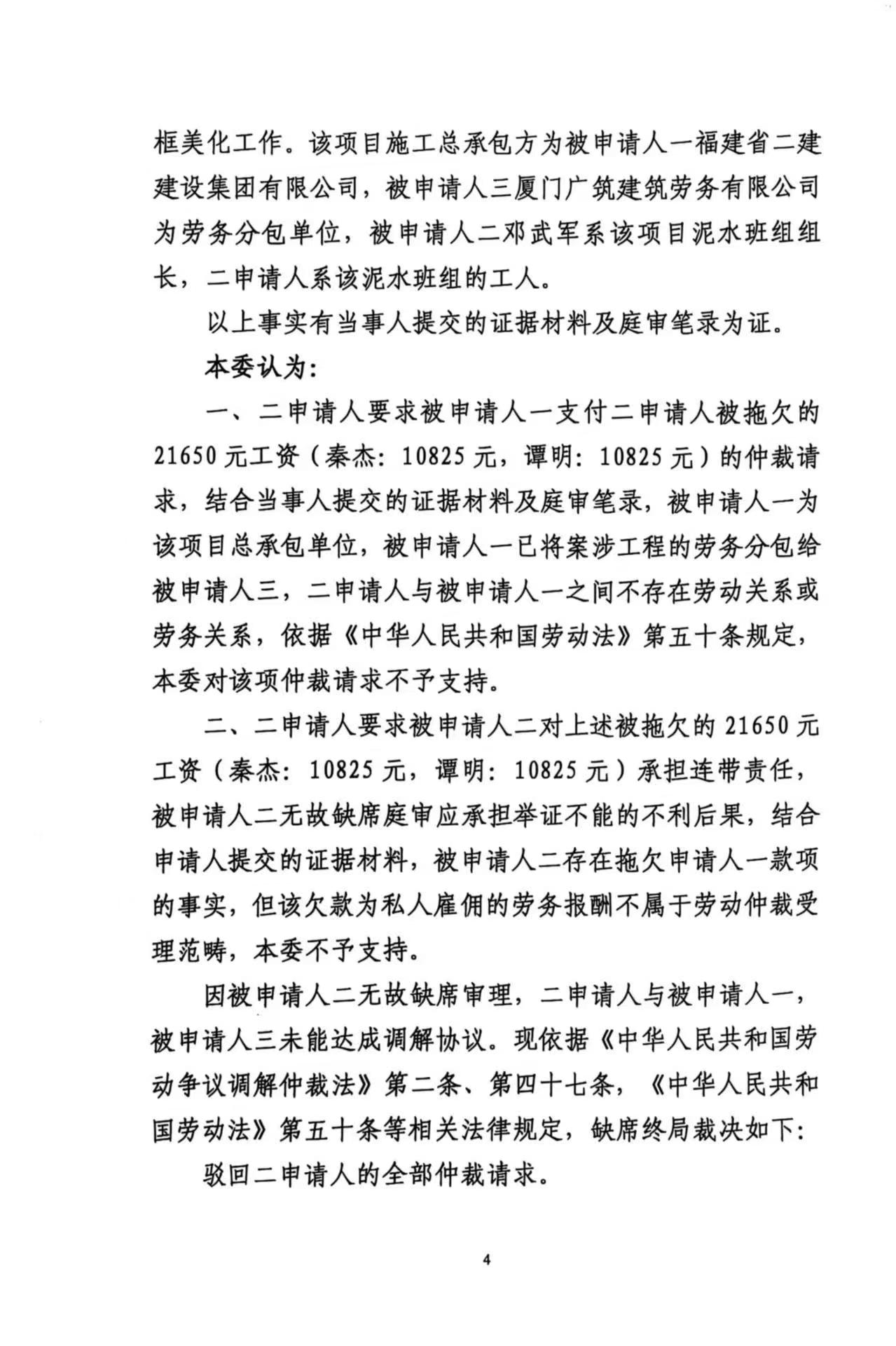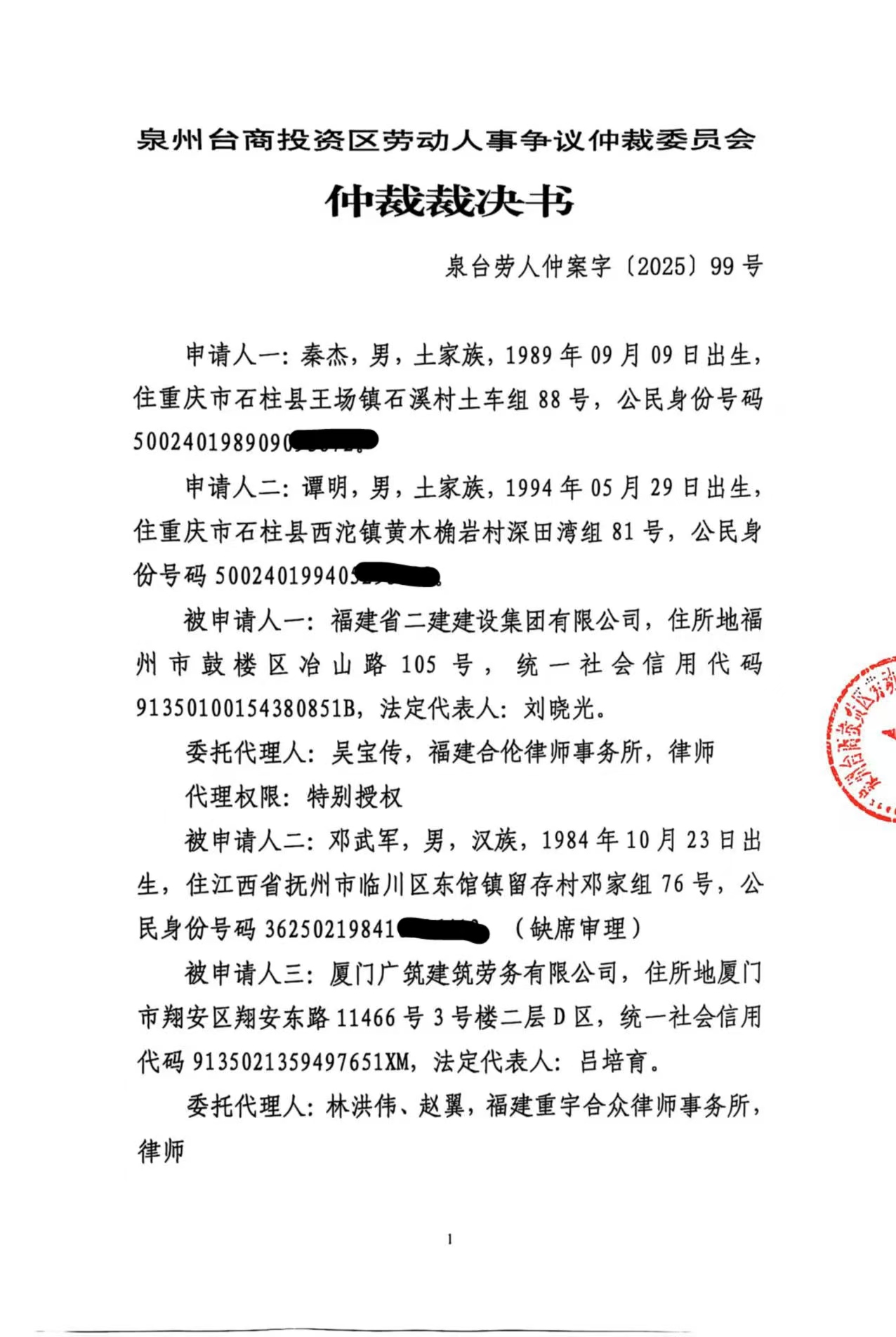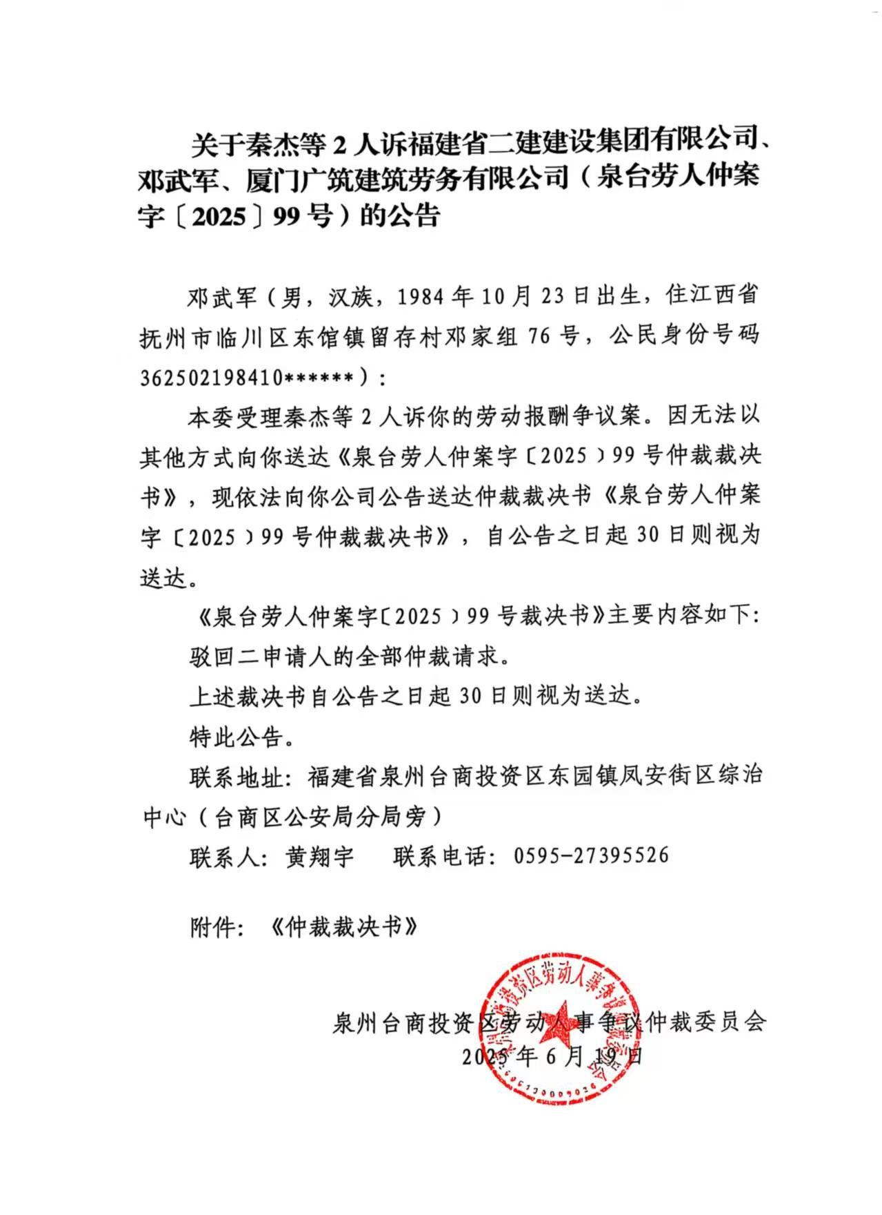 关于秦杰等2人诉福建省二建建设集团有限公司、邓武军、厦门广筑建筑劳务有限公司(泉台劳人仲案字[2025]99号)仲裁裁决书的公告