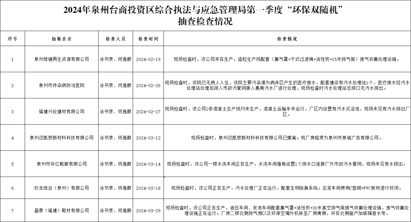 【“双随机、一公开”】2024年泉州台商投资区综合执法与应急管理局第一季度“环保双随机” 抽查检查情况