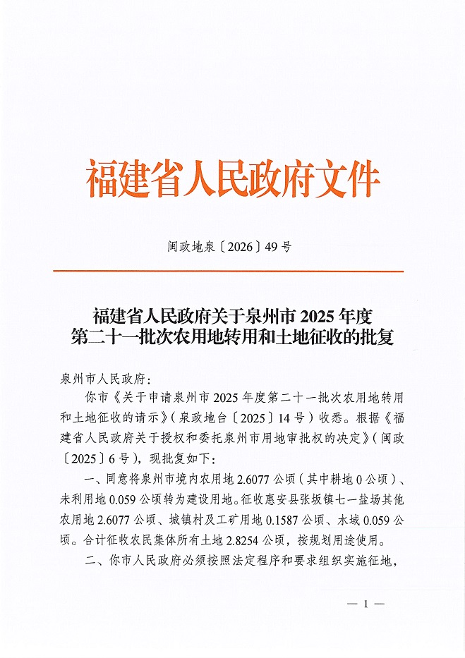 泉州市2025年第二十一批次农用地转用和土地征收的批复