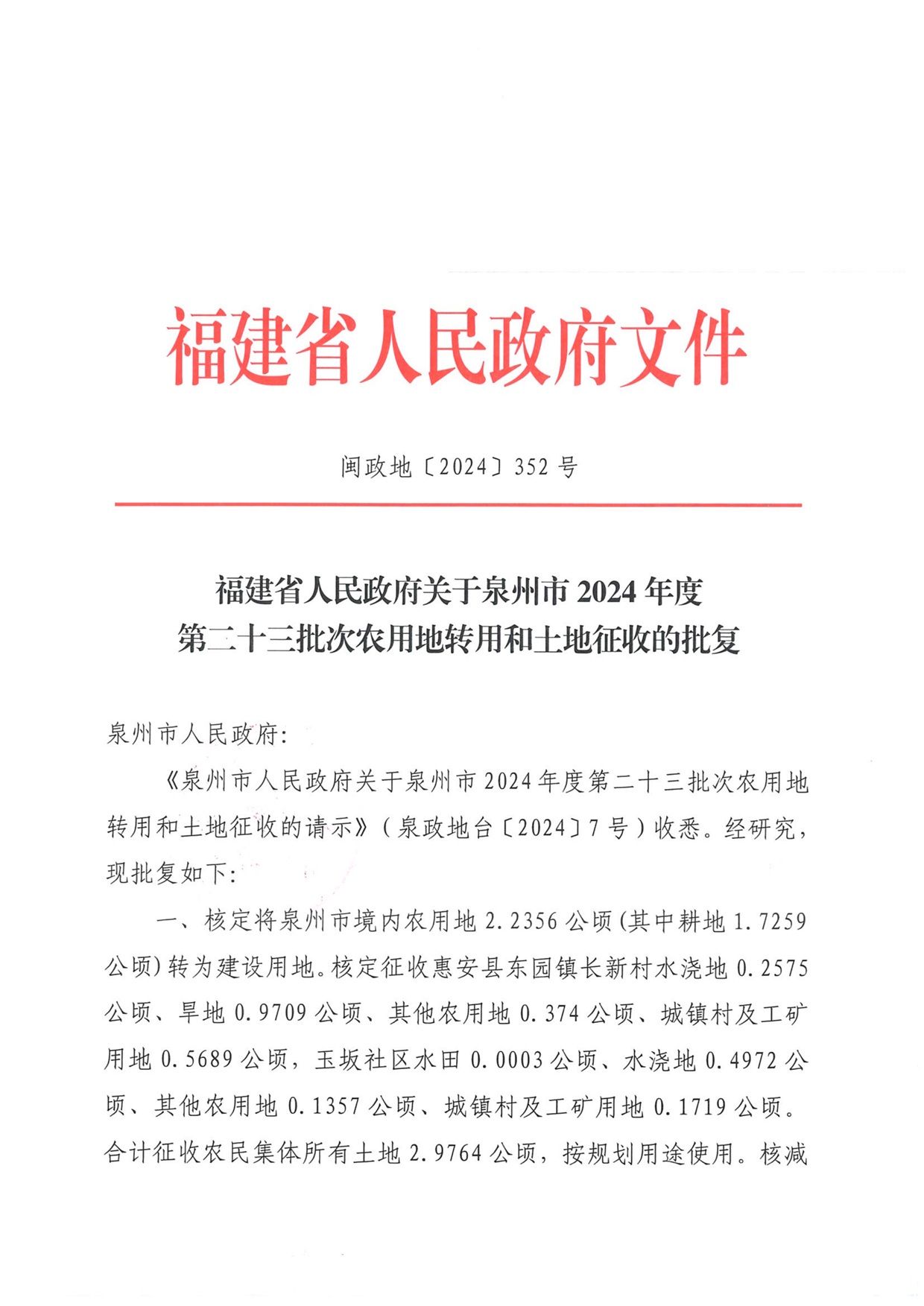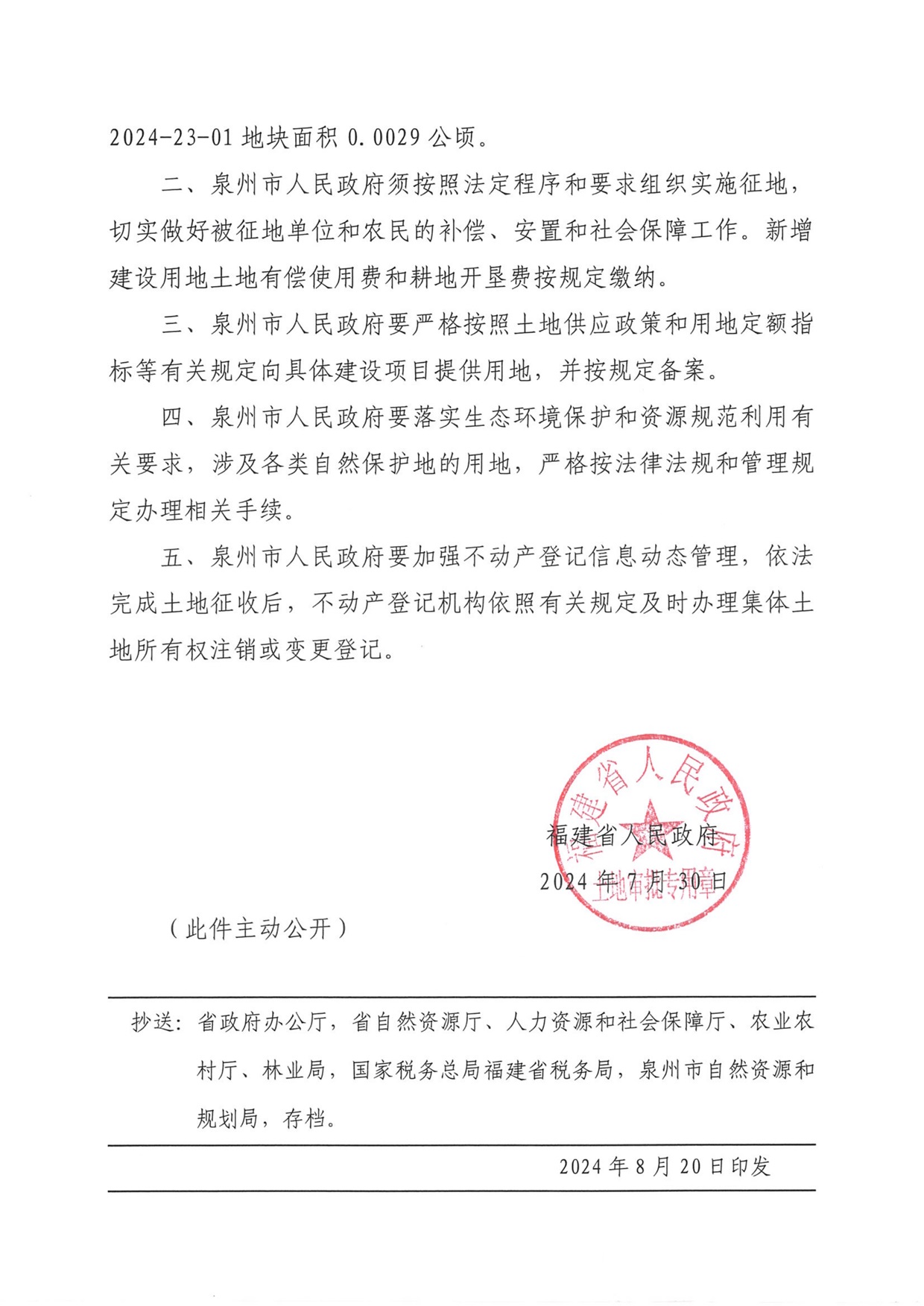 福建省人民政府关于泉州市2024年度第二十三批次农用地转用和土地征收的批复