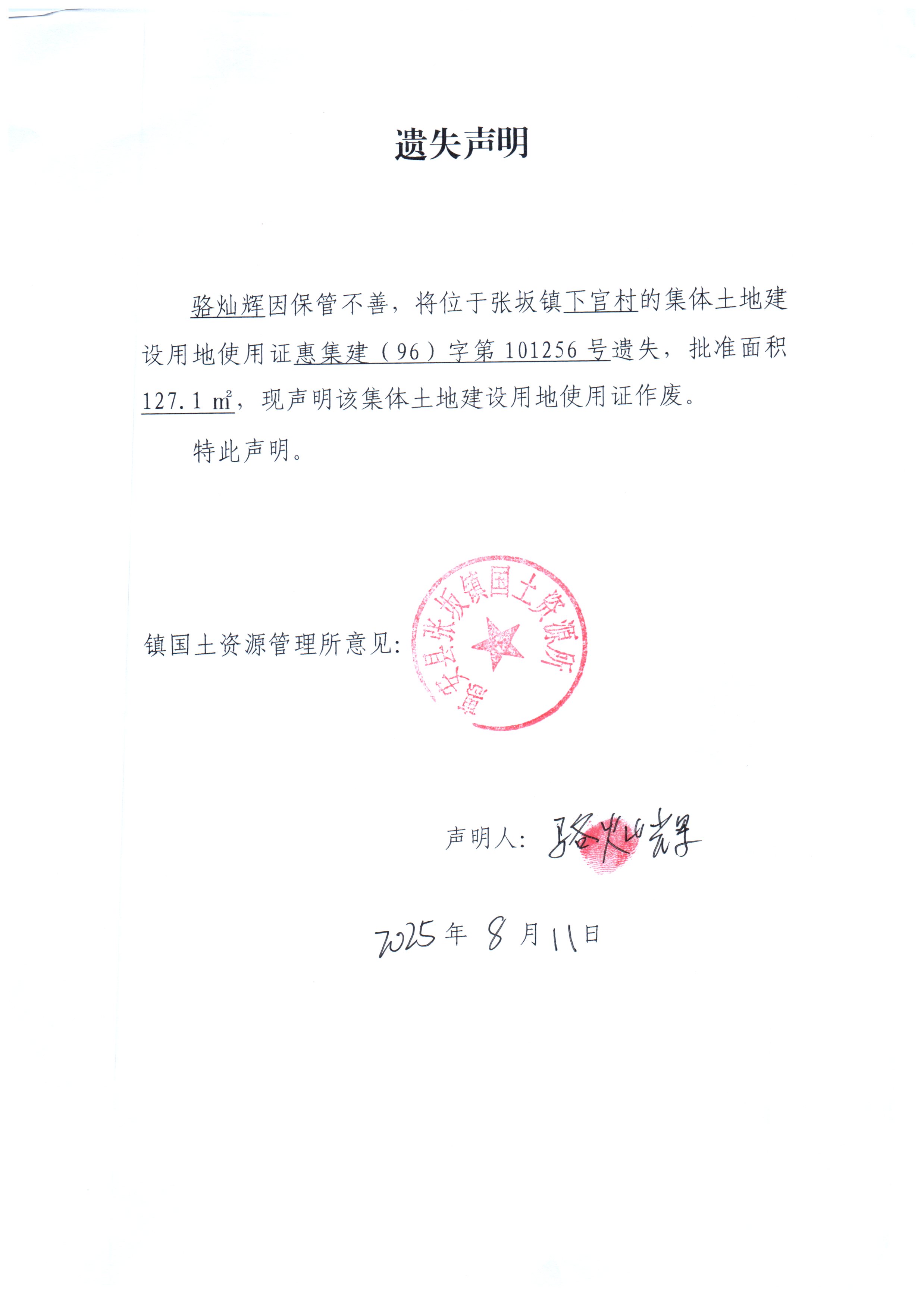 骆灿辉因保管不善,将其名下坐落于泉州台商投资区张坂镇下宫村东垵59号【证号:惠集建(96)字第101256号】不动产权证书遗失,根据《不动产登记暂行条例实施细则》第二十二条的规定申请补发,现予以公告。原不动产权证书同时作废。